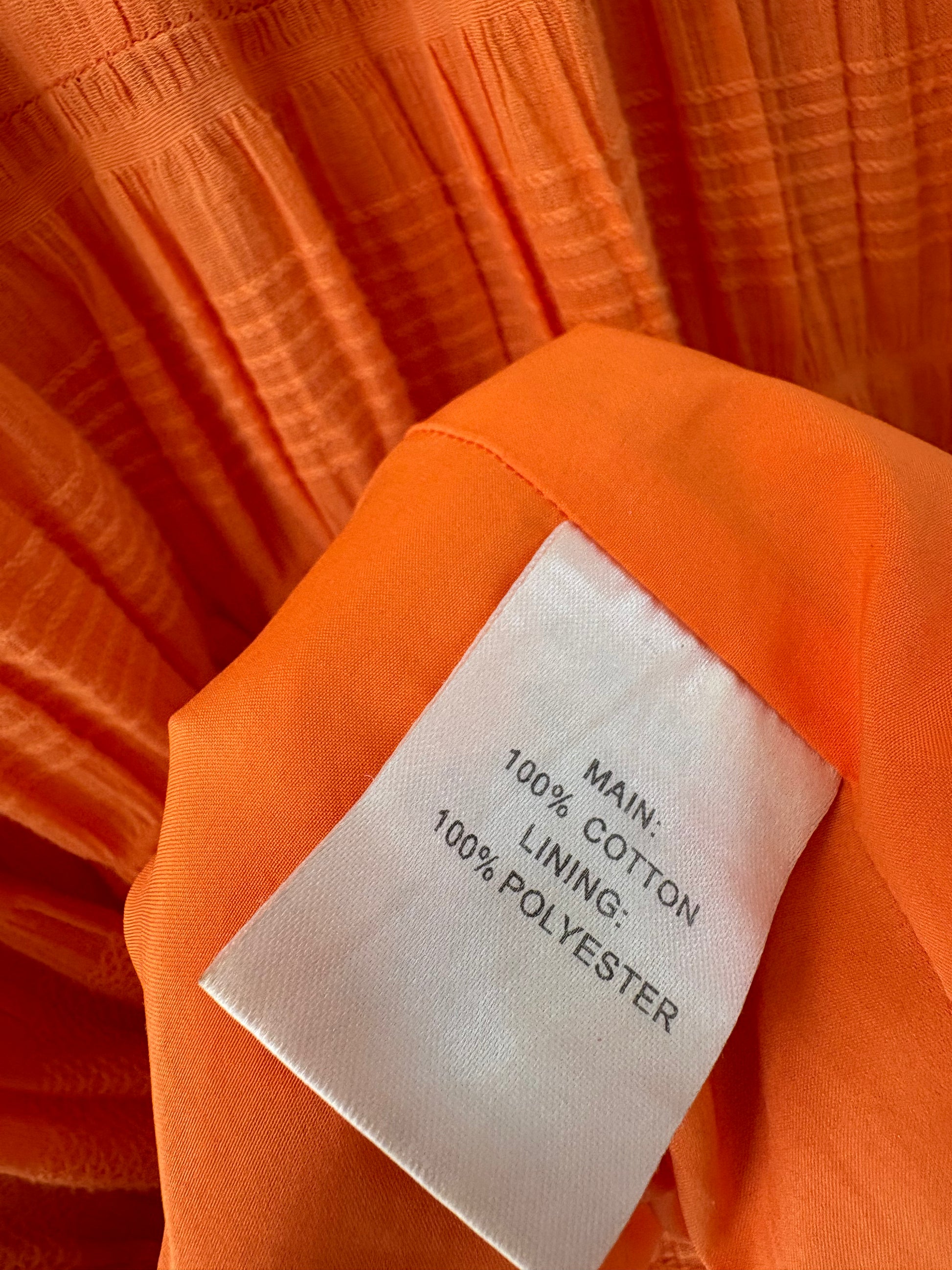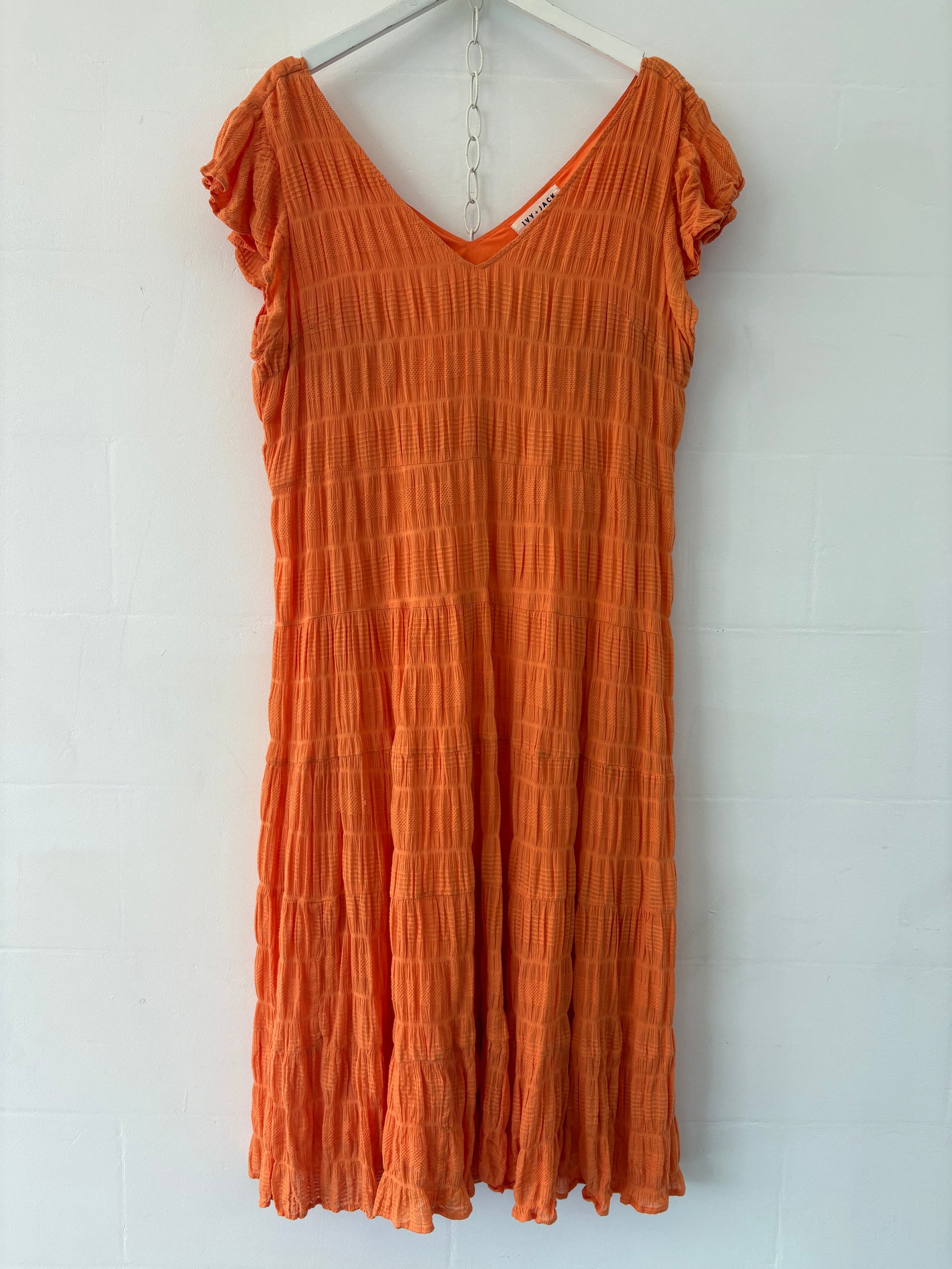 Orange knee-length dress with short sleeves.