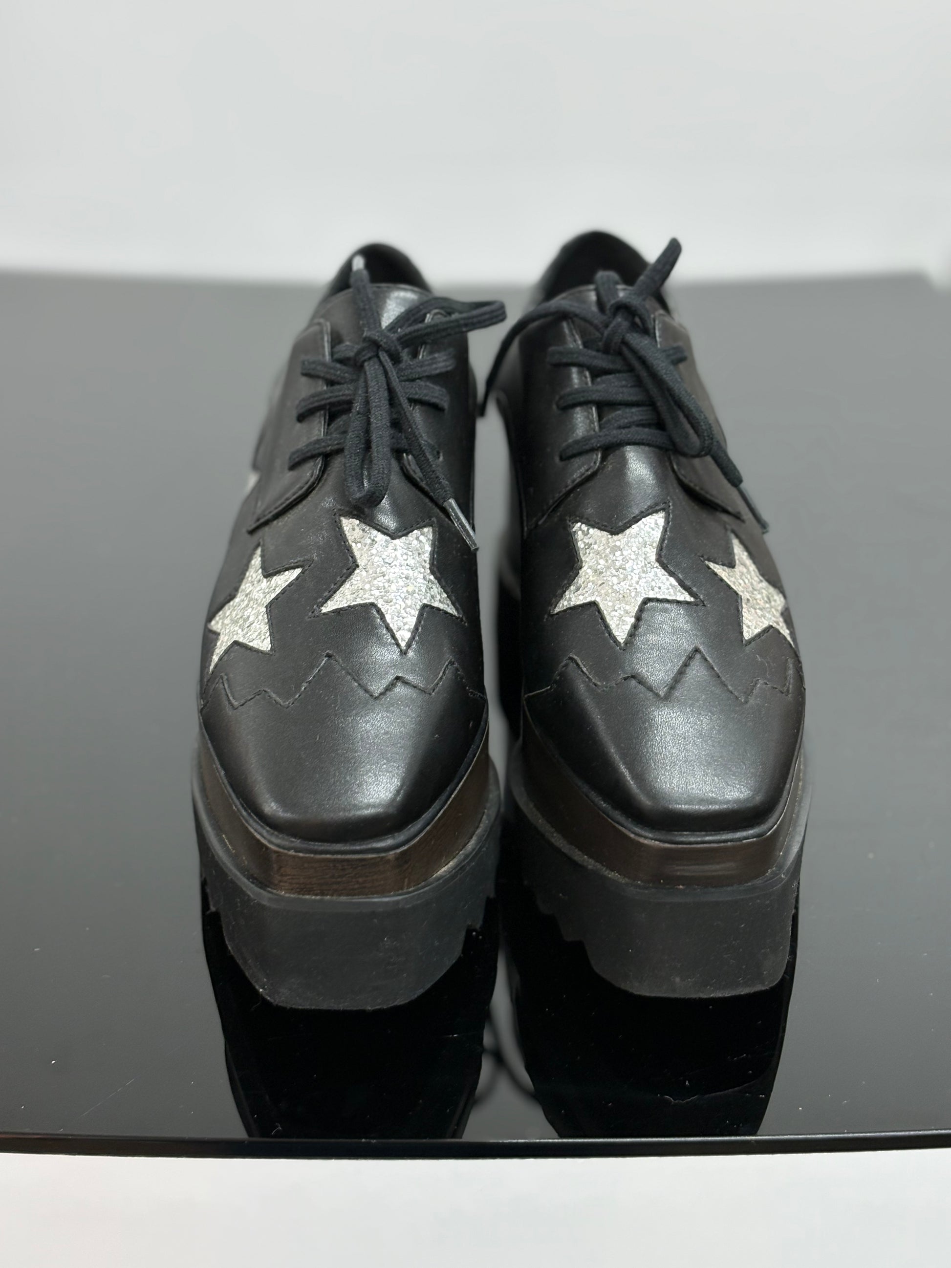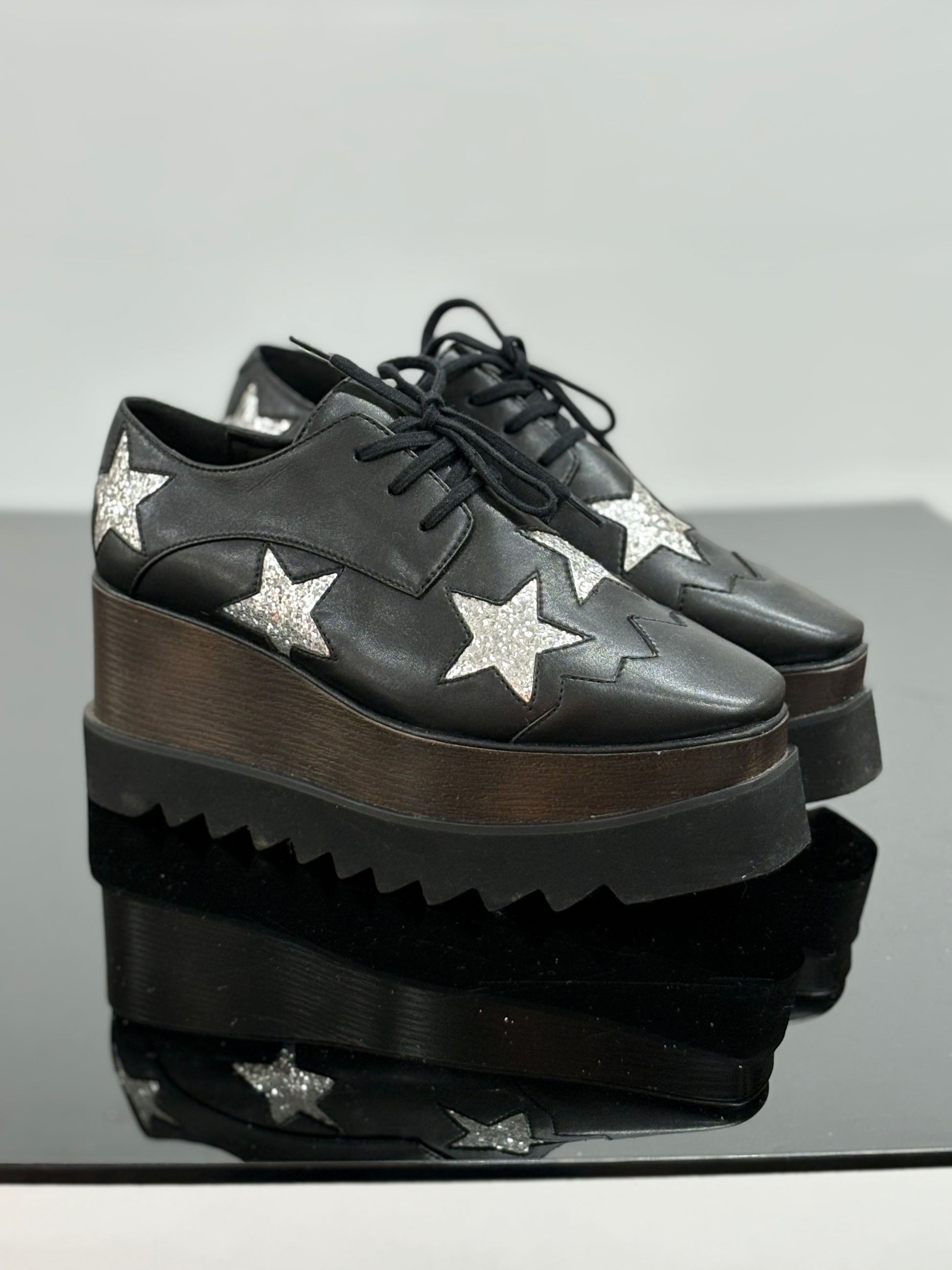 Stella Mccartney black platform shoes with silver star detail.