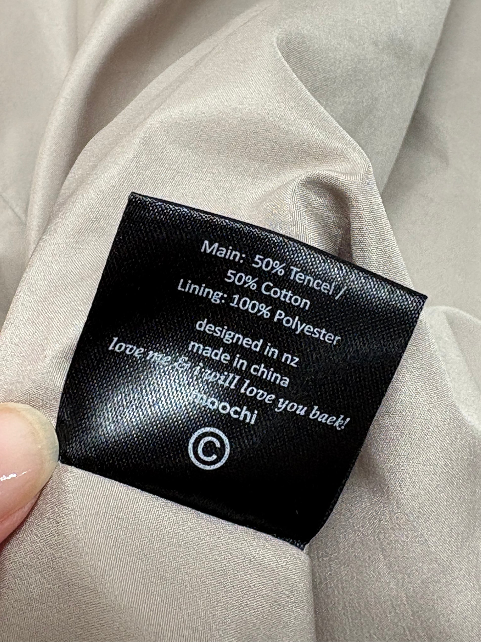 50% Tencel, 50% Cotton. Lining: 100% Polyester.